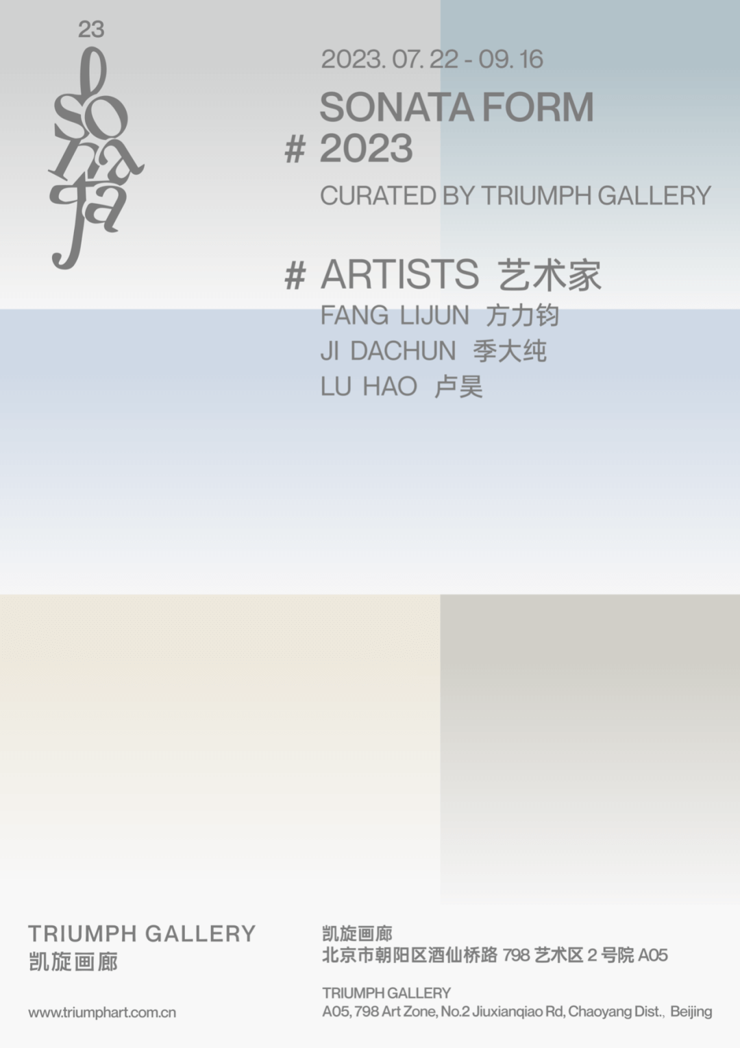 凱旋畫廊榮宣佈於2023年7月22日至9月16日期間,在畫廊空間內呈現藝術家方力鈞(b.1963,中國)、季大純(b.1968,中國)、盧昊(b.1969,中國)的三人群展「SONATA FORM # 2023」。 展覽呈現三位藝術家的20餘件不同材質的作品。