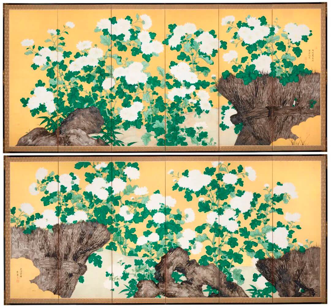 屏風 六曲一雙;水墨設色、胡粉、金銀葉,紙面