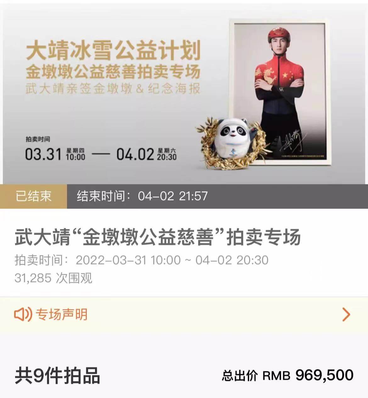 3月31日至4月2日,經過3天的競拍,北京保利線上拍賣“金墩墩公益慈善拍賣專場”9件拍品100%成交,武大靖獲得的北京冬奧獎牌選手專屬吉祥物金墩墩最終以92萬元人民幣成交、網絡圍觀人數超3萬次,從流量和金額上都驗證了保利網拍的可能性。