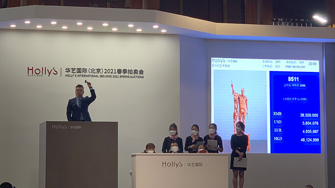 2021年6月5日,華藝國際北京春拍“大美——古代書畫珍品之夜”、“大美——古代宮廷器物夜場”和“現當代藝術夜場”三大夜場震撼來襲!達米恩⸱赫斯特於現當代藝術夜場上拍,《聖徒巴多羅買—劇痛》估價2200萬-3000萬人民幣,現場經過激烈的競投、最後兩位展開拉鋸戰、以3600萬人民幣落槌、加佣金以4140萬人民幣成交,8565號牌投得。 (打破了曾在香港保持的1550萬港幣保持的紀錄)
