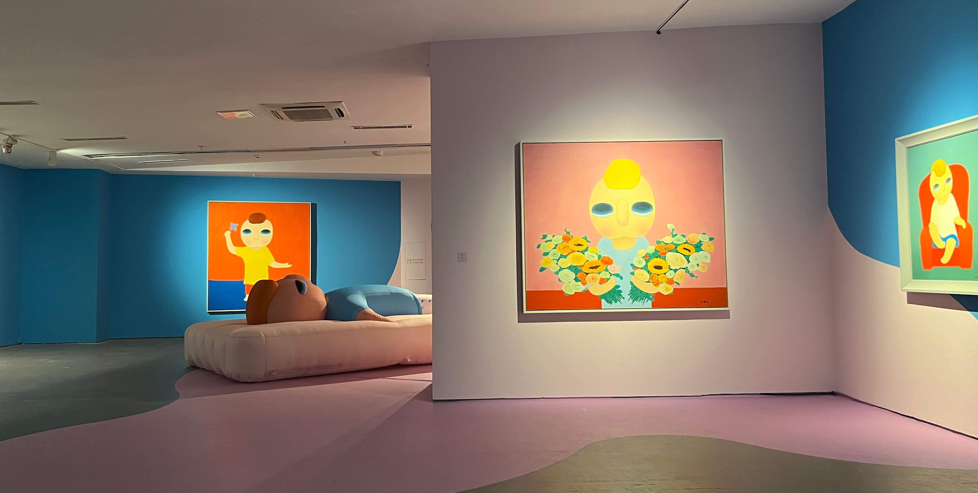 作品之外,備受觀者熱評的展廳設計也是一大看點。 色彩、流線形的地貼貫穿起整場展覽的視覺統一性,每個單元的故事也由不同的顏色劃分。展廳一層是藝術家的創作手稿及其它文獻資料,深度展示蔡萬霖和“yy”幕後的故事;除繪畫、雕塑作品外,蔡萬霖還為本次展覽全新創作了陶瓷、炫彩及馬賽克作品,這些新作與數字藝術作品展示區一同設置於展廳二層,呈現出藝術家對於新技術和數字媒介的運用。