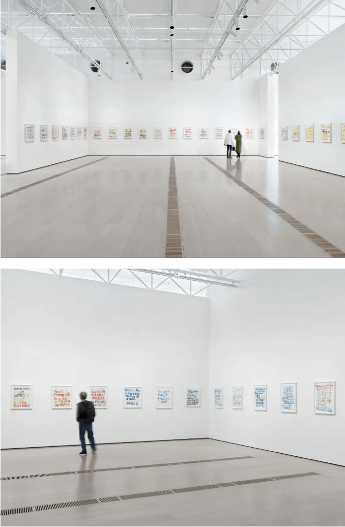 在展廳的中途,觀眾可以看到《玫瑰問題》(Th Rose Prblm,2015),這是一組由48幅不同繪畫組成的作品,取自兩個短語——格特魯德·斯坦(Gertrude Stein)的詩《神聖的艾米麗》(Sacred Emily,1913)中“玫瑰是玫瑰是玫瑰”(“a rose is a rose is a rose”),以及成語“聞起來像玫瑰”(“smelling like roses”,有“出淤泥而不染”之意)——圖畫經過手繪、剪切和拼接,形成各種可能的結果。霍恩對語言的概念化處理使其從無意義中獲得意義,藉此隱喻身份的易變性。