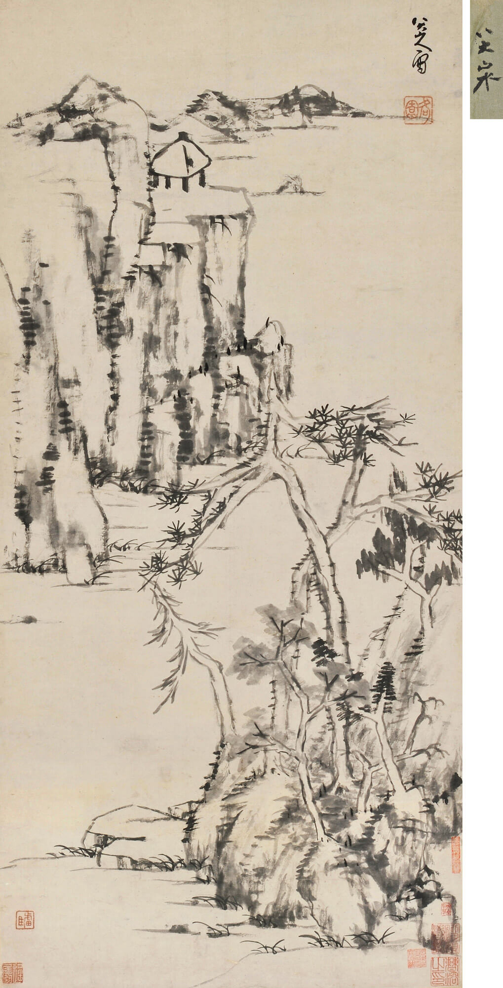 朱耷《仿倪瓚山水》估價2800萬-3500萬人民幣,最終以3600萬人民幣落槌、加佣金總共4140萬人民幣成交。 《仿倪瓚山水》是八大極為稀見的設色山水作品之一。畫面別有一種倪瓚雲林式的淡泊、寧靜,但仍然非常鮮明地編織進了八大山人獨特的山水情感體驗,融入了他的招牌式的冷寂、枯索和蒼涼。