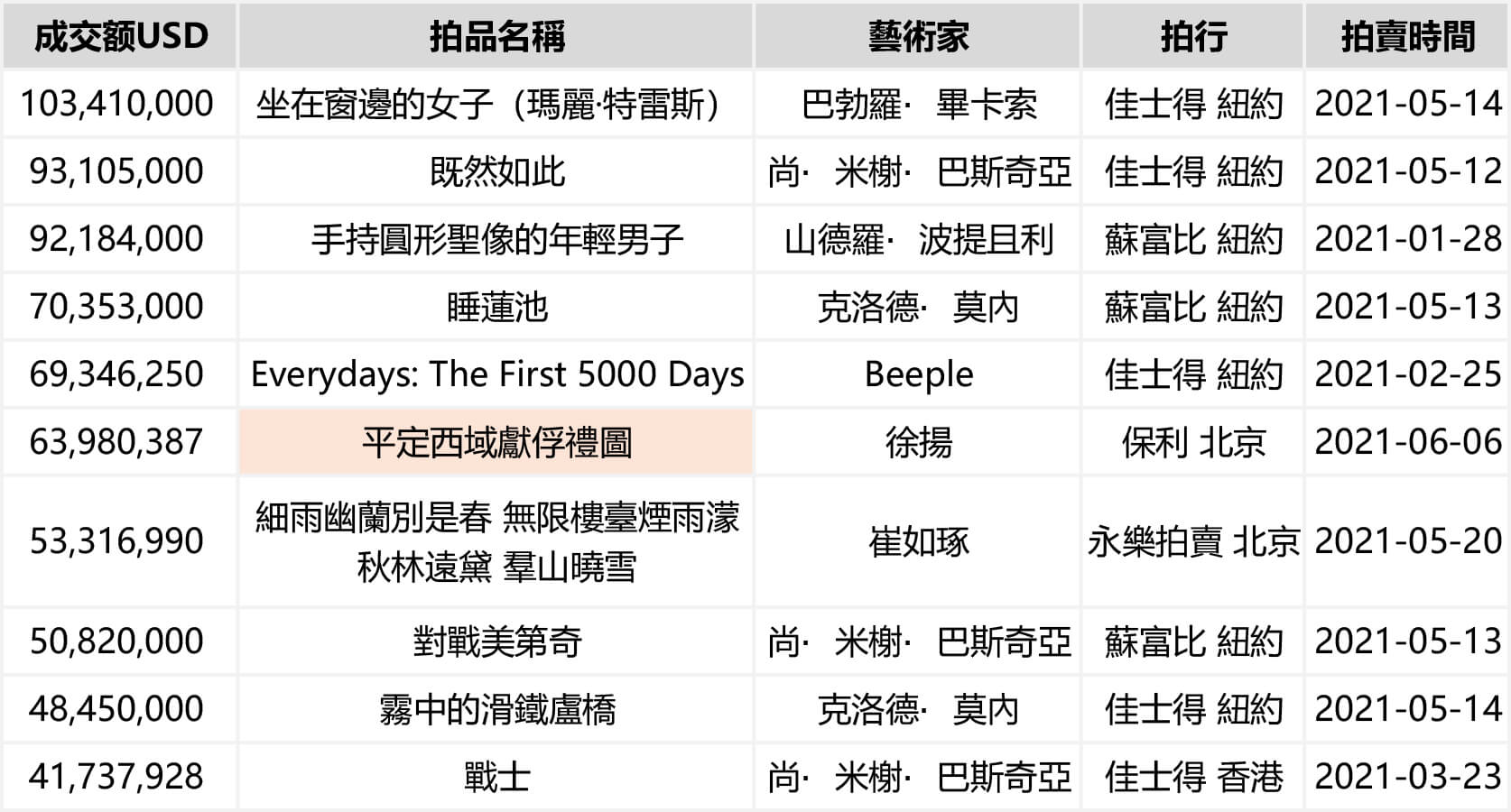 張深、金璿、楊維禎、俞宗禮、金廷標等7位藝術家打破了他們的個人拍賣紀錄。