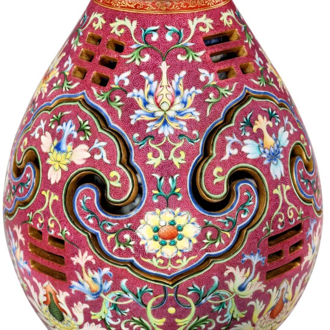 結構上,此器以內瓶為主,繪飾纏枝蓮紋,溢早明(1368-1644年)雅風,從外瓶玲瓏透雕隙縫窺看,彷彿乍見往昔皇室鼎盛,呼應清帝延襲前朝輝煌之說。