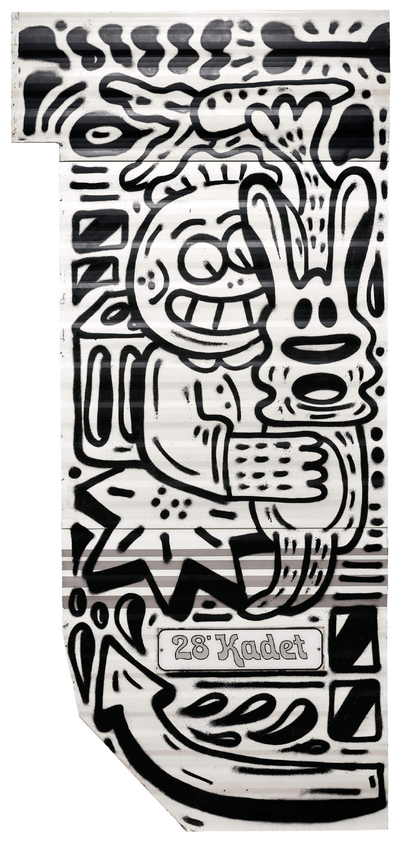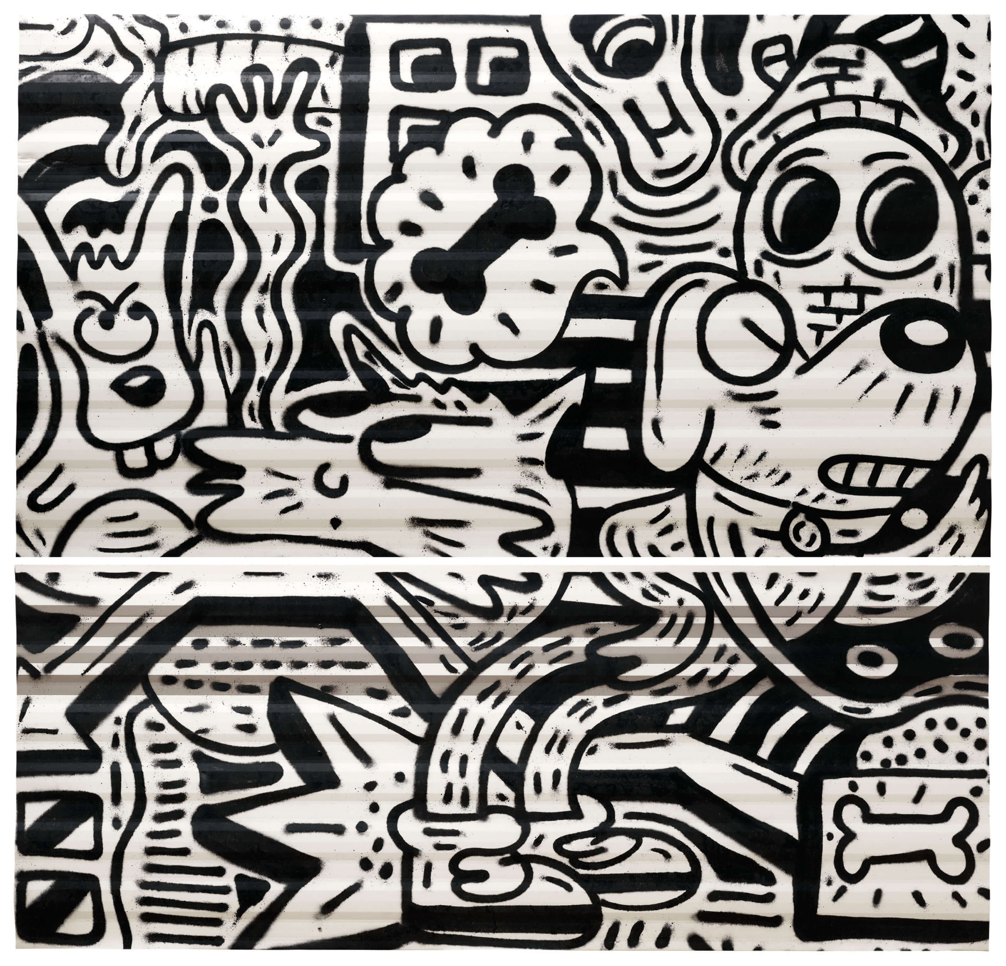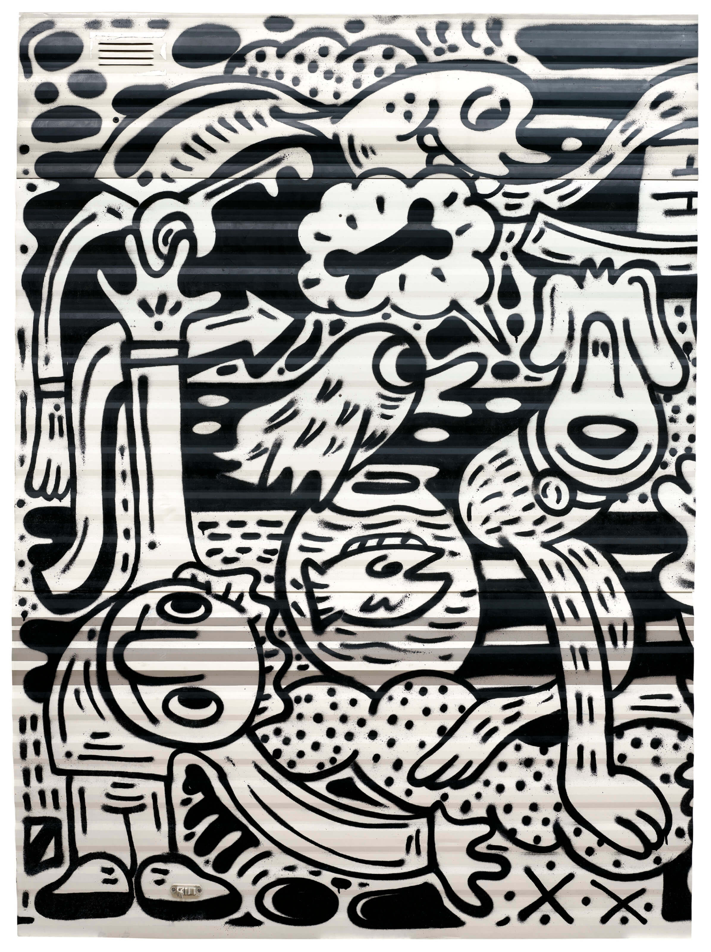 此次專場拍賣所展現的一系列作品尤為有趣、且別開生面:作品《右側第6號》保留了旅行車的整個車門,其上半部是一塊磨砂玻璃面板,下半部則有一個造型離奇、炯炯大眼的人物角色向門柄窺望,彷彿以眼神示意觀眾一探門後的“塗畫世界”(Doodle World);在《後側第5號》中,描繪了一隻雙頰鼓起的卡通螃蟹遊走在海灘上,並伴有太陽傘和海浪;上述場景和《後側第3號》同出一轍,其中另有一個戴著墨鏡的葫蘆臉型稀奇角色。