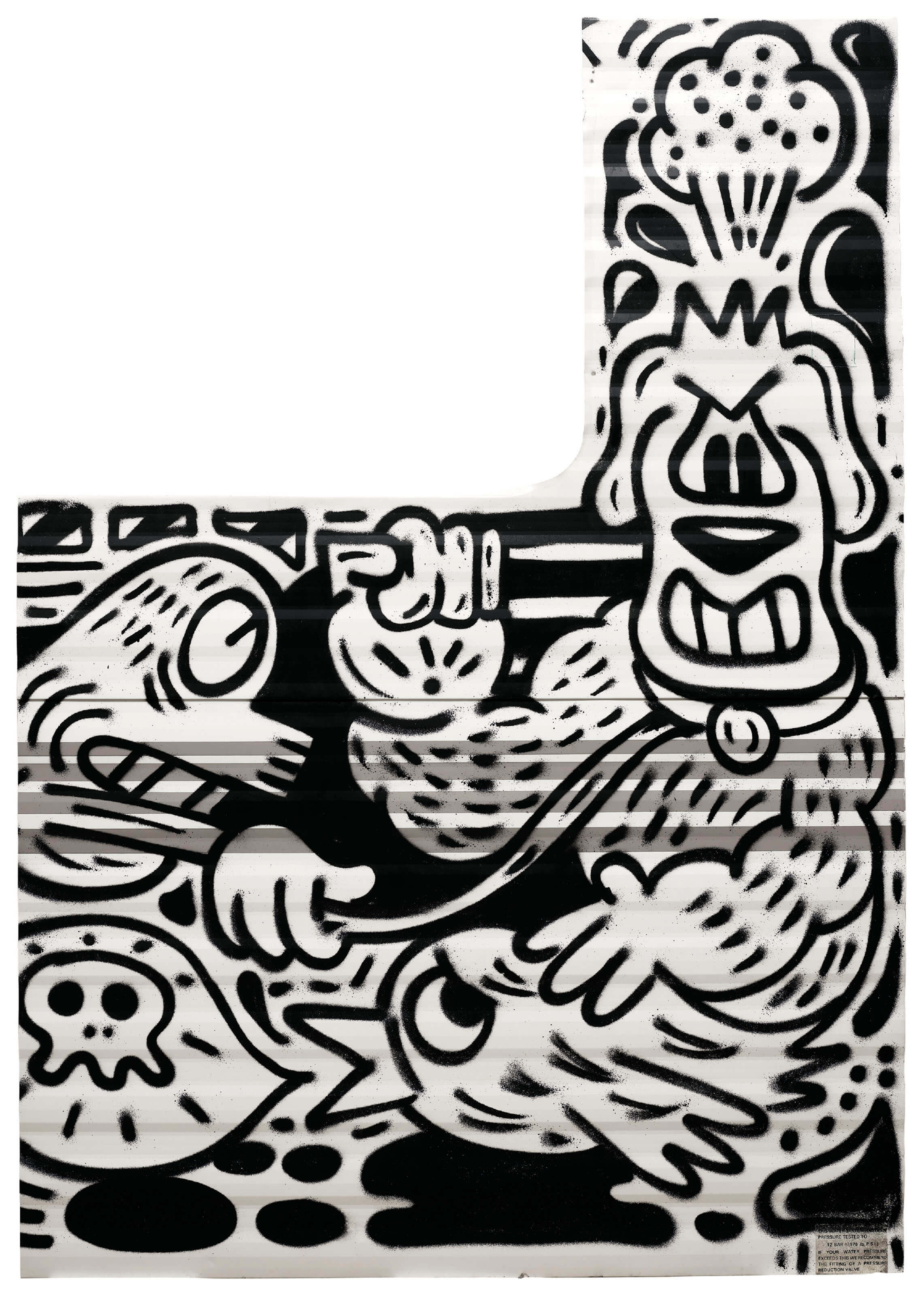 作品《右側第6號》保留了旅行車的整個車門,以580萬港幣落槌、加佣金72.5萬港幣成交。當中黑白色的塗畫圖案面積較大,而藝術家近期作品中的人物角色則比較細小和密集。
