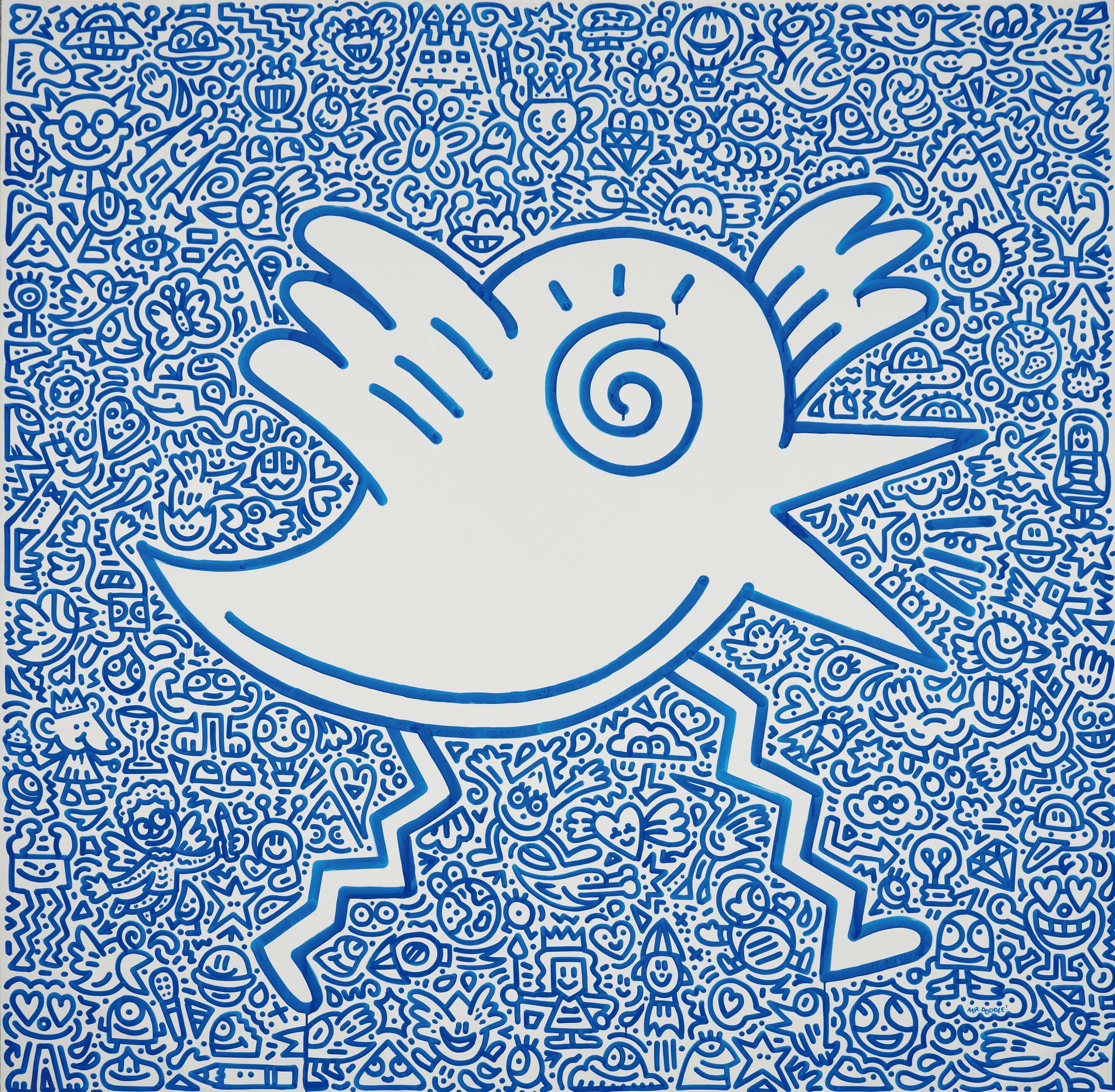 2019 年3 月,Mr. Doodle 以個展的形式參加東京藝術博覽會。這場展覽的大獲成功,成為他踏入日本響亮的頭炮。個展結束不久,便被當地邀請各種藝術活動,更是定下了8 月代官山、9 月京都舉行個展。本次上拍的《藍鳥》正是出自此行的代官山展覽。