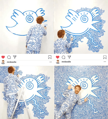《藍鳥》創作於2019年,2019 年可謂是Mr. Doodle 最勤奮的一年,剛剛成立了一年的「Mr. Doodle 工作室」,正是需要建立個人品牌的關鍵時期,他陸續建立官方FB 以及IG,通過各種社交平臺不斷分享自己的作品,在線上線下拓展他的「意粉塗鴉」王國。