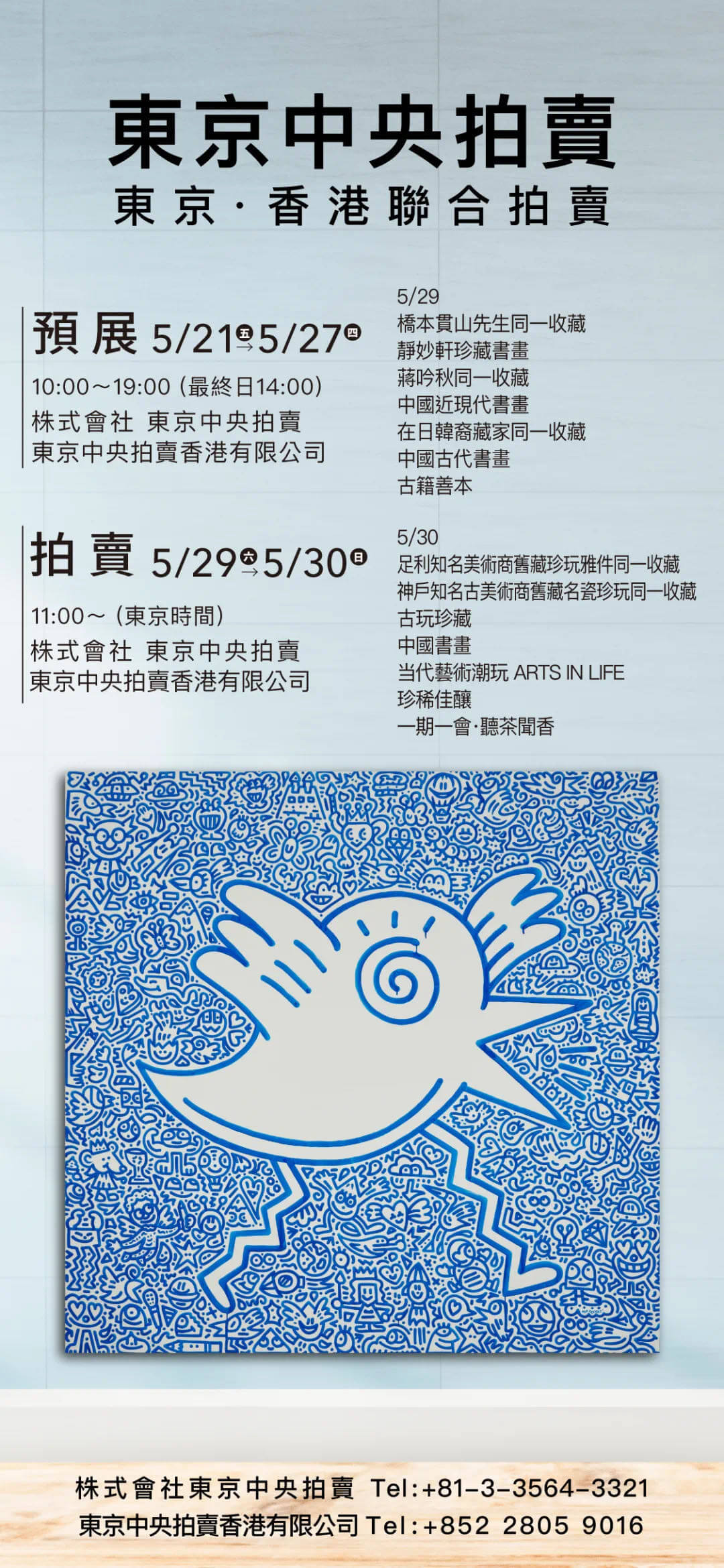 在即將來臨的盛夏,重磅內容正式揭幕: 5月29-30日,東京・香港聯合拍賣將正式舉槌,為廣大藏家和藝術愛好者們精心策劃並挑選了多元的收藏品。屆時將推出14個專場、包括橋本貫山先生同一收藏、靜妙軒同一收藏、蔣吟秋同一收藏、在日韓裔藏家同一收藏、足利知名美術商舊藏專場、神戶知名古美術商舊藏專場、中國近代書畫、中國古代書畫,古籍善本、瓷器雅玩、文房四譜、一期一會聽茶聞香、當代藝術潮玩、珍稀佳釀等專場,其中「Arts In Life」當代藝術潮玩自2019年推出以來早已成為最早推出當代潮玩專場的領頭羊,此次以MR. Doodle《藍鳥》領銜的經典鉅作更加引人注目,奈良美智、Adam Handler、Yoon Hyup、En Iwamura等藝術家的拍品邀您共享驚豔的視覺盛宴。