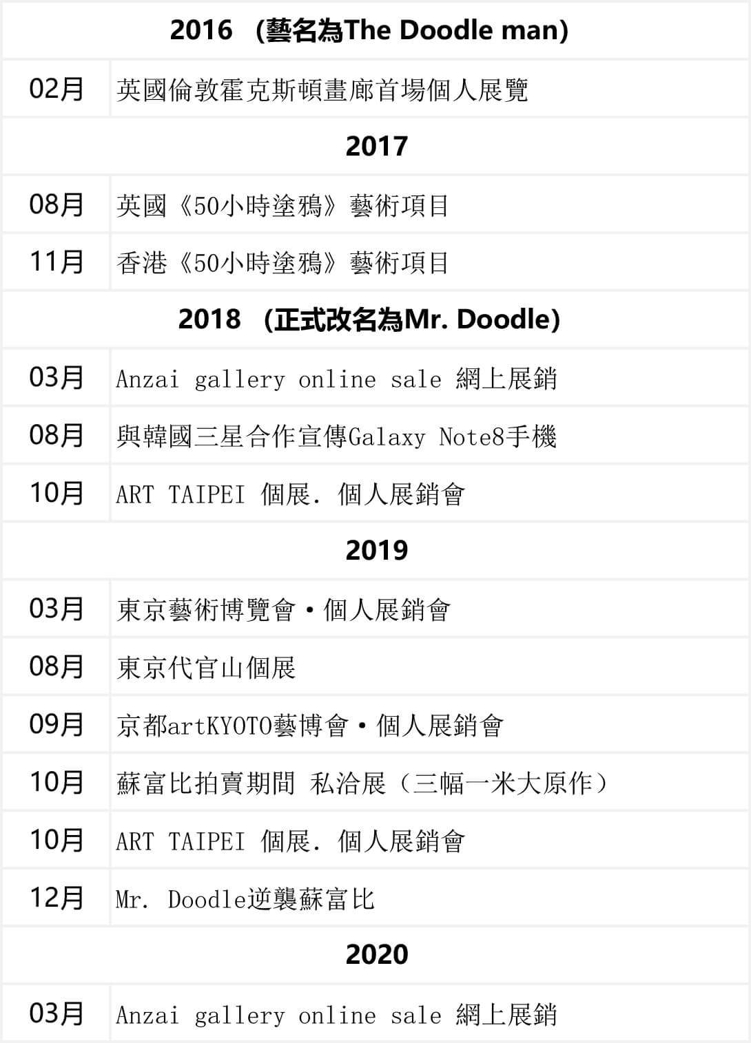 2021年,蘇富比香港、富藝斯香港等拍行都曾多次上拍Mr Doodle的作品,其中《彈》、《向日葵》在蘇富比香港大幅超估價成交、超低估率500%以上;值得一提的是,Mr Doodle在東京中央拍賣的最貴三幅作品都創造了個人在拍賣市場的新戰績,尤其4米巨畫《春》於2020年8月上拍東京中央登場,以估價近12倍的JPY 9.500萬落槌,連傭JPY 1.09億(合90.2萬美元)成交,《春》大幅刷新個人拍賣紀錄,至今依舊是藝術家的Top1的作品,也反映出市場對於藝術家的瘋狂追捧。