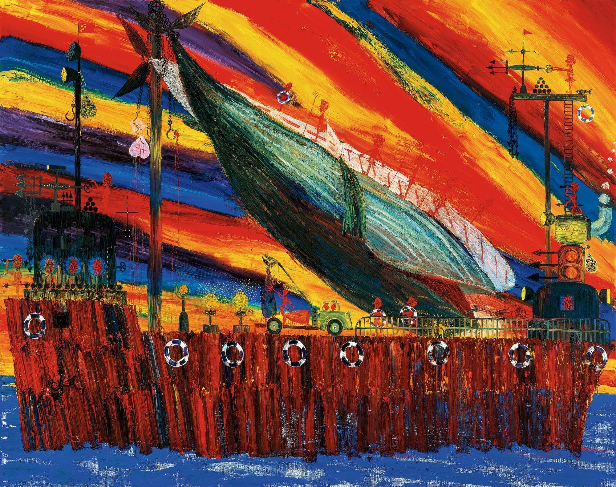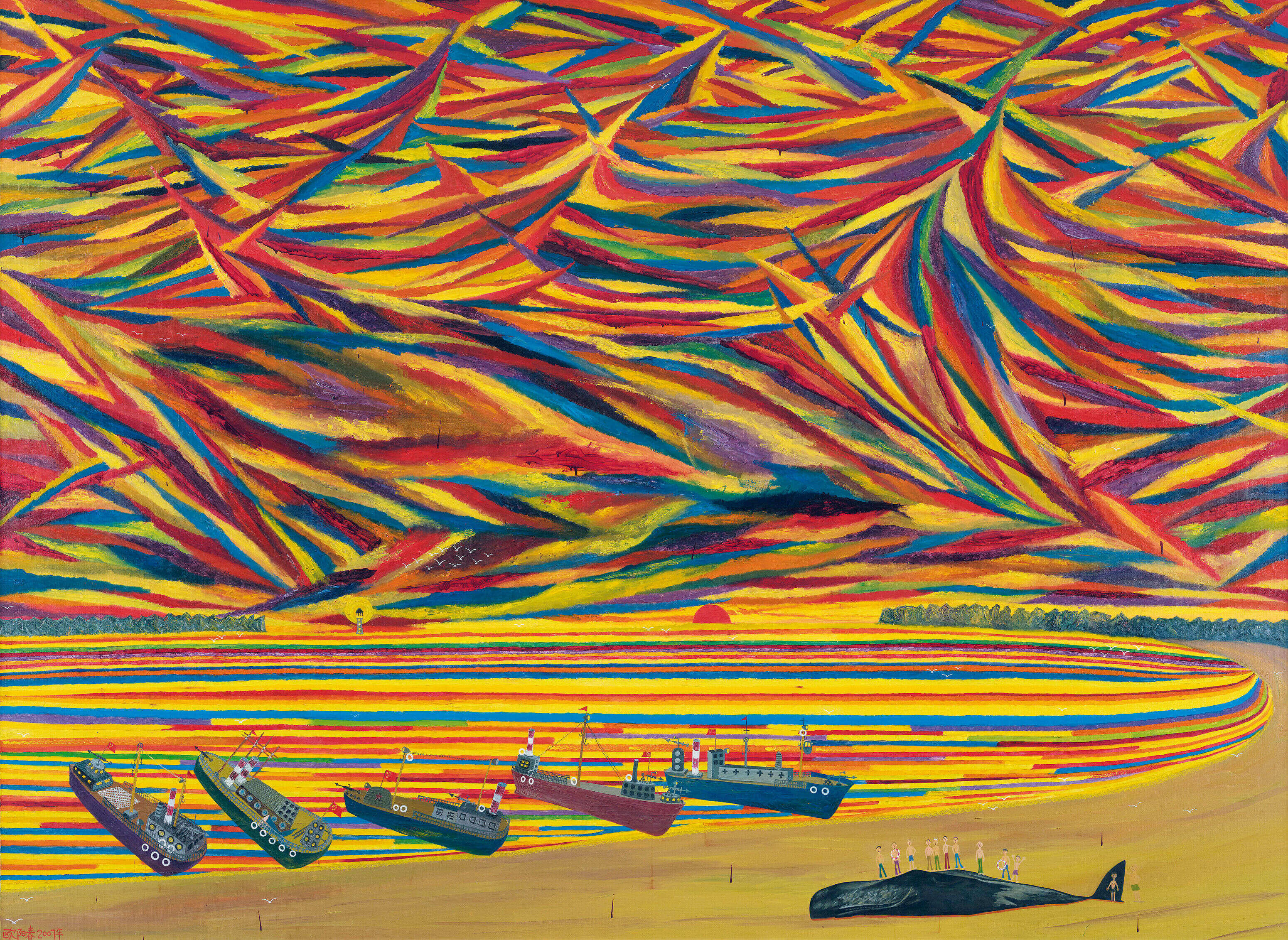 In 2007, Ouyang Chun entered the heyday of creation, with more full and bright color processing, and the texture of brush strokes It is also more free and easy in appearance, and various images and schemas are more fantastic and changeable, incorporating strong absurdity and symbolic meaning. During this period, Ouyang Chun created his famous works "Whaling Series" and "King Series", which have become the most competitive works in the auction market since then.