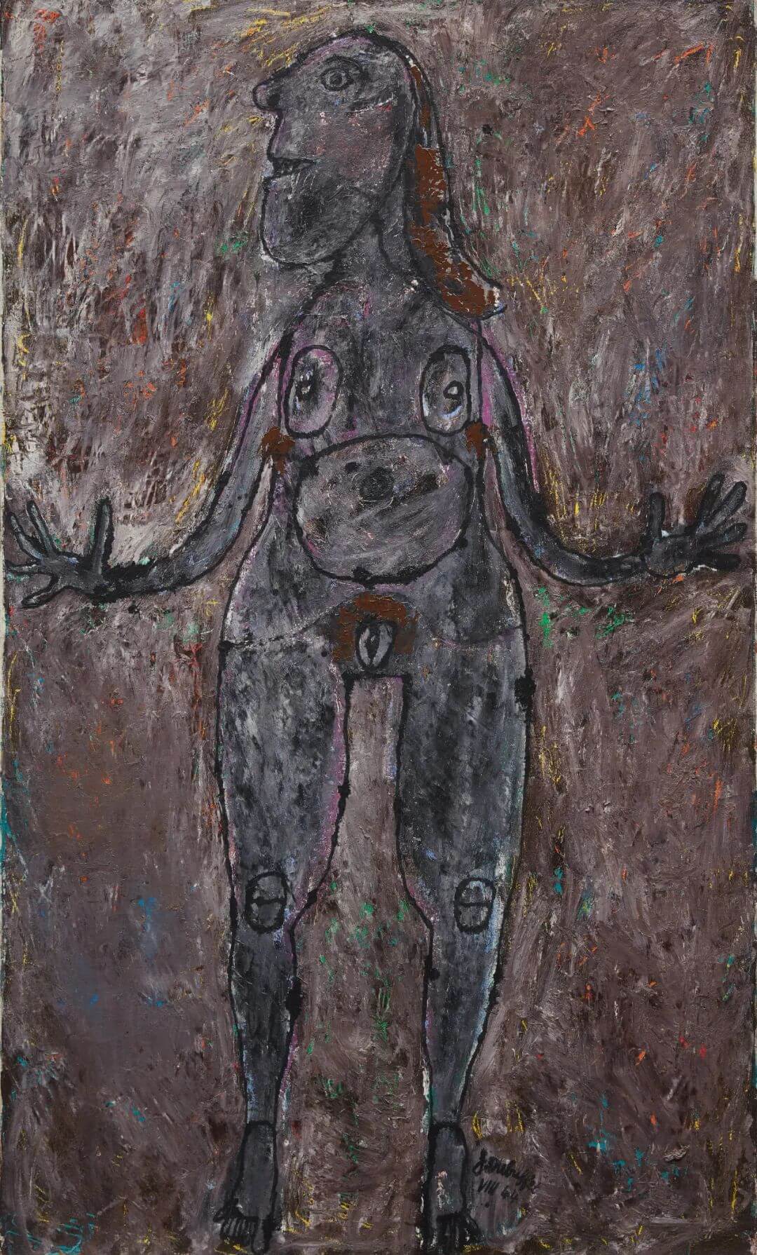 《大型炭黑色裸像》是尚·杜布菲創作的首幅裸體大畫,也是麥克羅威收藏中的唯一一件杜布菲作品,曾經在主要回顧展中展出。 作品創作於1944年,正是杜布菲回歸繪畫創作兩年後——經過專心經營家族葡萄酒生意的八年間歇期之後。帶著激烈的原生藝術(Art Brut)風格,杜布菲對女性裸體的描繪並非故意苛刻,而是對西方傳統美學標準發起挑戰。