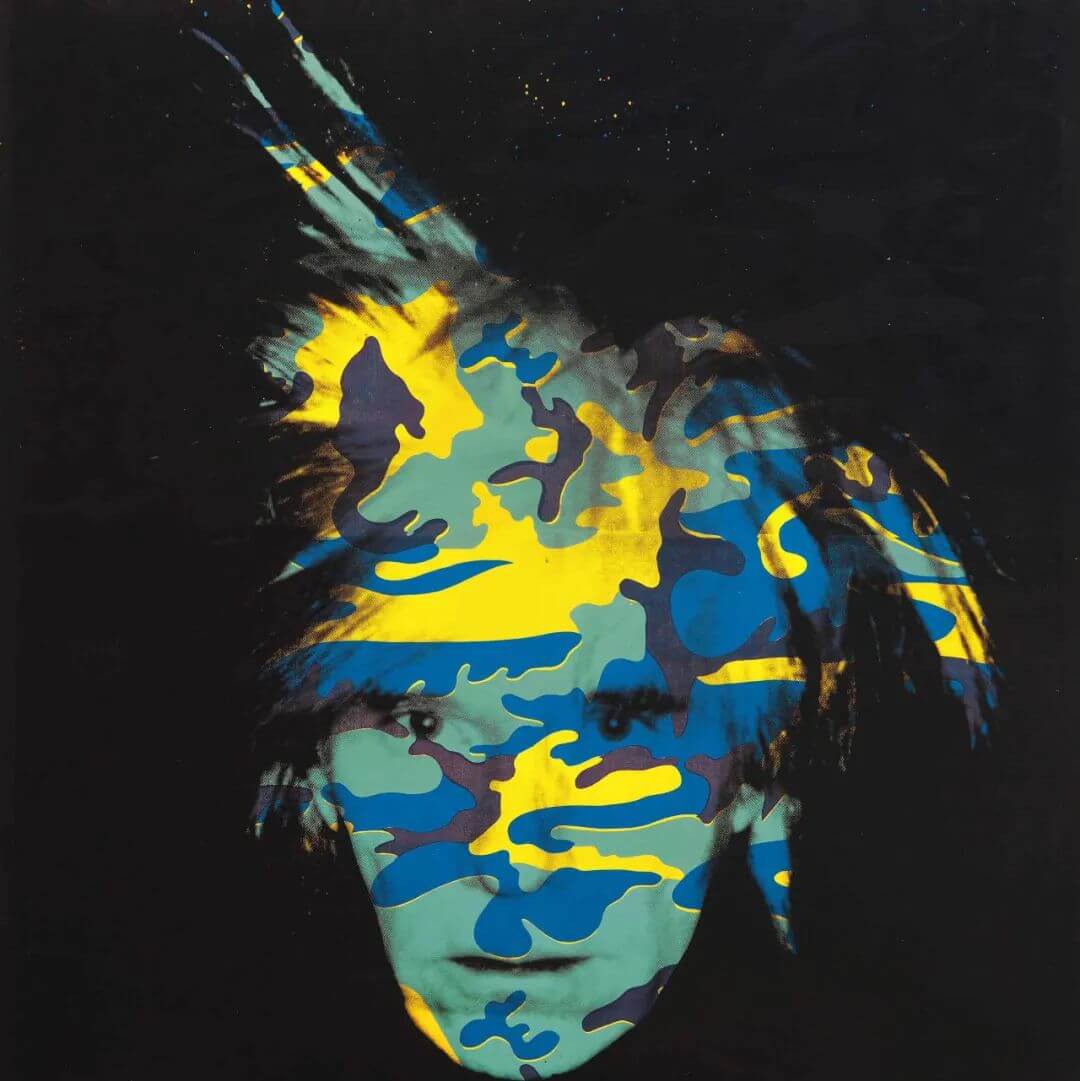 在這件非凡傑作中,沃荷的臉被迷彩面紗覆蓋:一副預示性的死亡面具。此系列可以說是沃荷最後一次極力為自己締造終極的標誌式圖像地位,其重要性足以與早前作品的主導形象瑪麗蓮夢露相提並論。然而藝術家在作品中採用憂傷的色調,似乎反映出他的意識——自己雖在名聲上或可與夢露相仿,卻永遠不會體會到真正的傳奇地位,因為傳奇只在逝世後才會誕生。