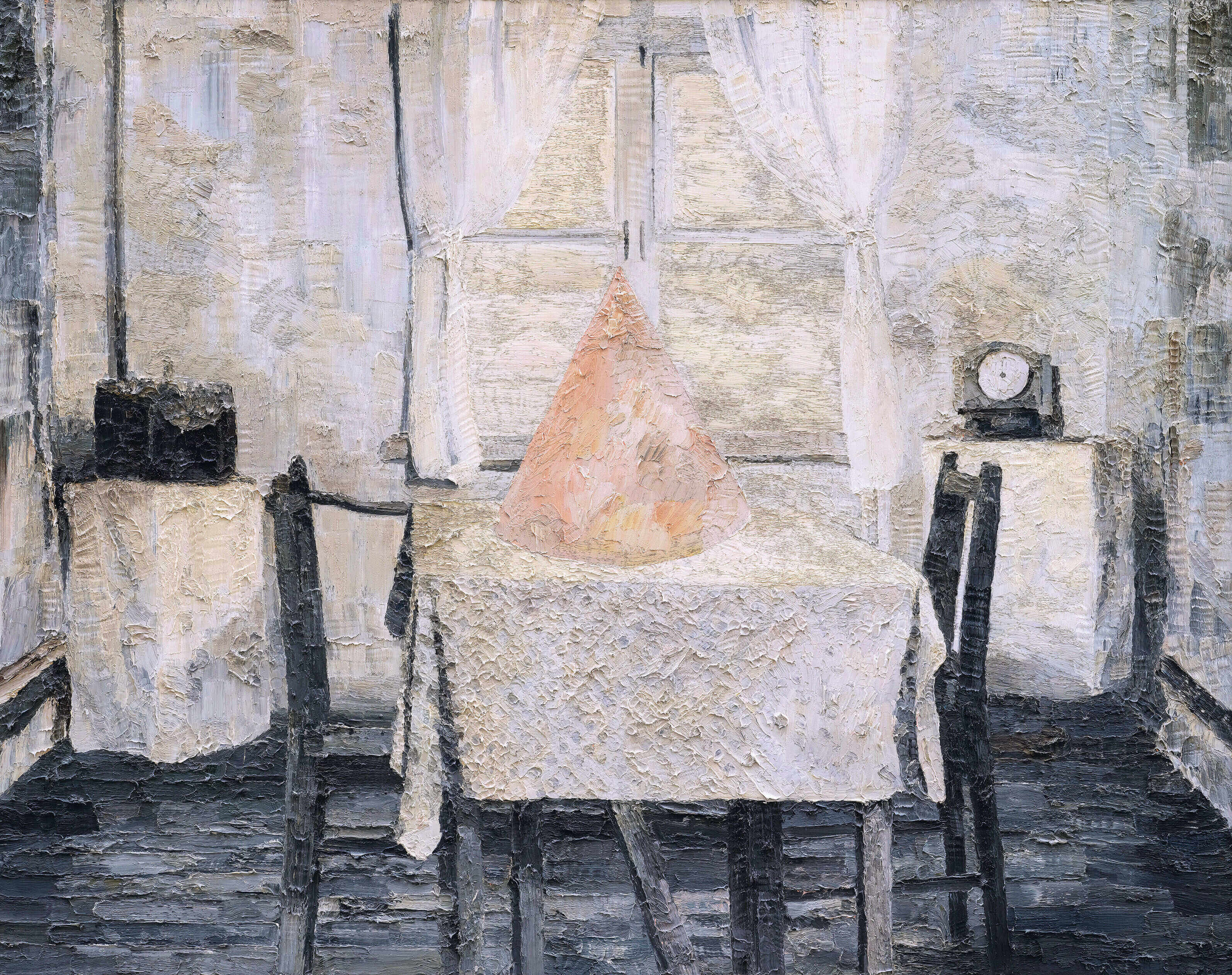 隨著上一代人的挫折感與失落感的蔓延,惶惑逐漸累積了一種病症,就像是一個龐大的精神廢墟,又帶著些個人記憶的溫情。這些矛盾複雜的情緒構成了這件作品的核心之一。 在畫面處理上,前景的「桌面」向後退縮,使「正對著」我們的那片「桌布」強烈地凸起,這種凸起既是視錯覺的,也是實感的,既來自透視法與光影法,也來自加厚的顏料與加劇的筆觸。