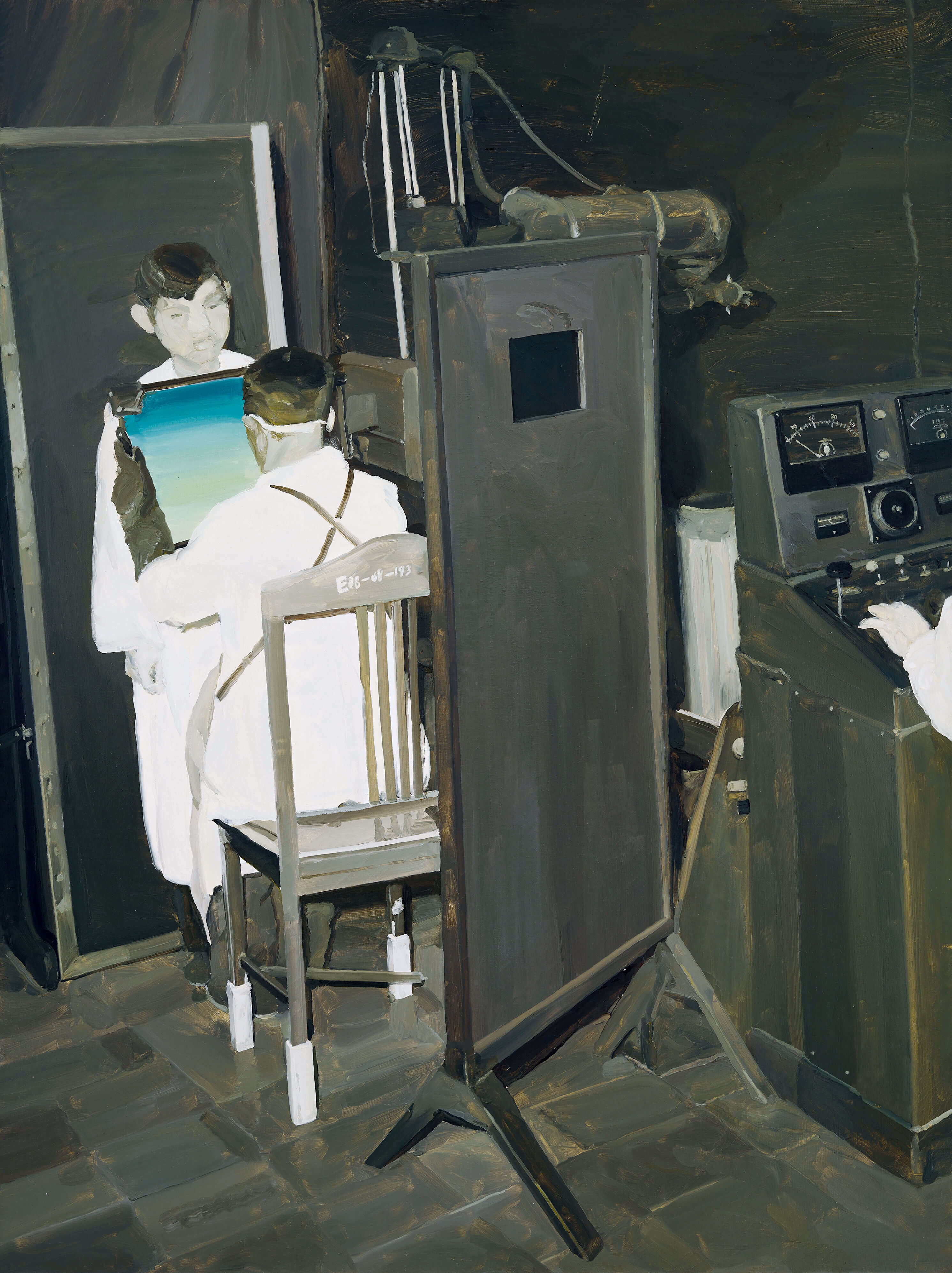 《國營物》這件巨幅油畫源於仇曉飛幼年時的一張照片,質感粗糲又斑駁不均的黑白傢俱遵循著嚴格的對稱原則,安全而穩定。這是1950年代中國工人階級家庭的典型樣貌,甚至到了藝術家童年時的1980年代也隨處可見。藝術家將照片鏡像化,象徵著時代的劇變和翻轉,曾經的憧憬和安定逐漸變成了一種精神上的惶惑感,滲透到家庭中。