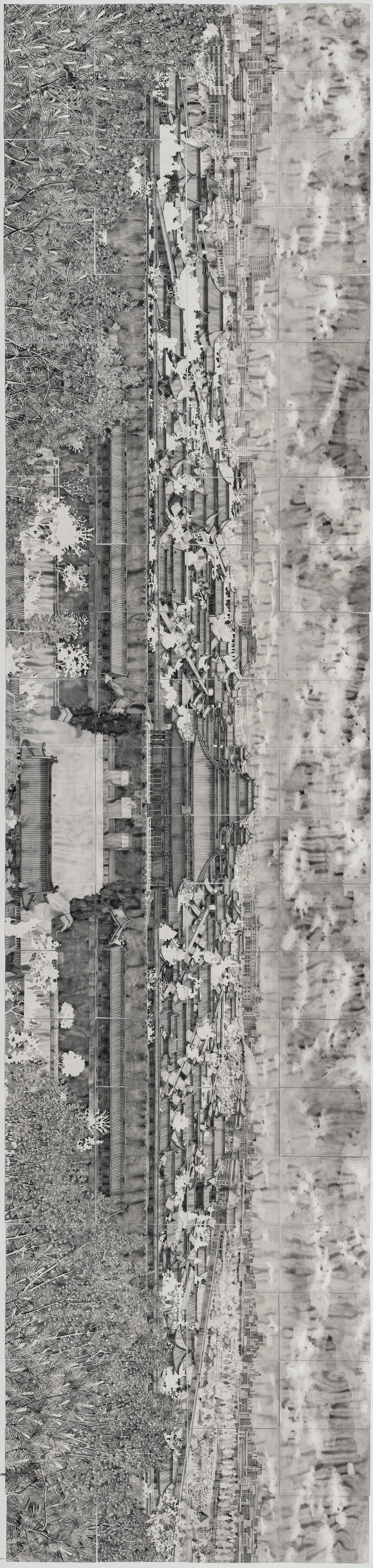 得益於本館特有的空間優勢,長達56公尺的超尺度影像《2012生成與彌散》首次完整展出。巨幅水墨新作《盛夏》《美麗鄉村》也試圖透過更生動的呈現形式,拓展傳統藝術的視覺邊界,營造出更具空間敘事性的欣賞體驗。