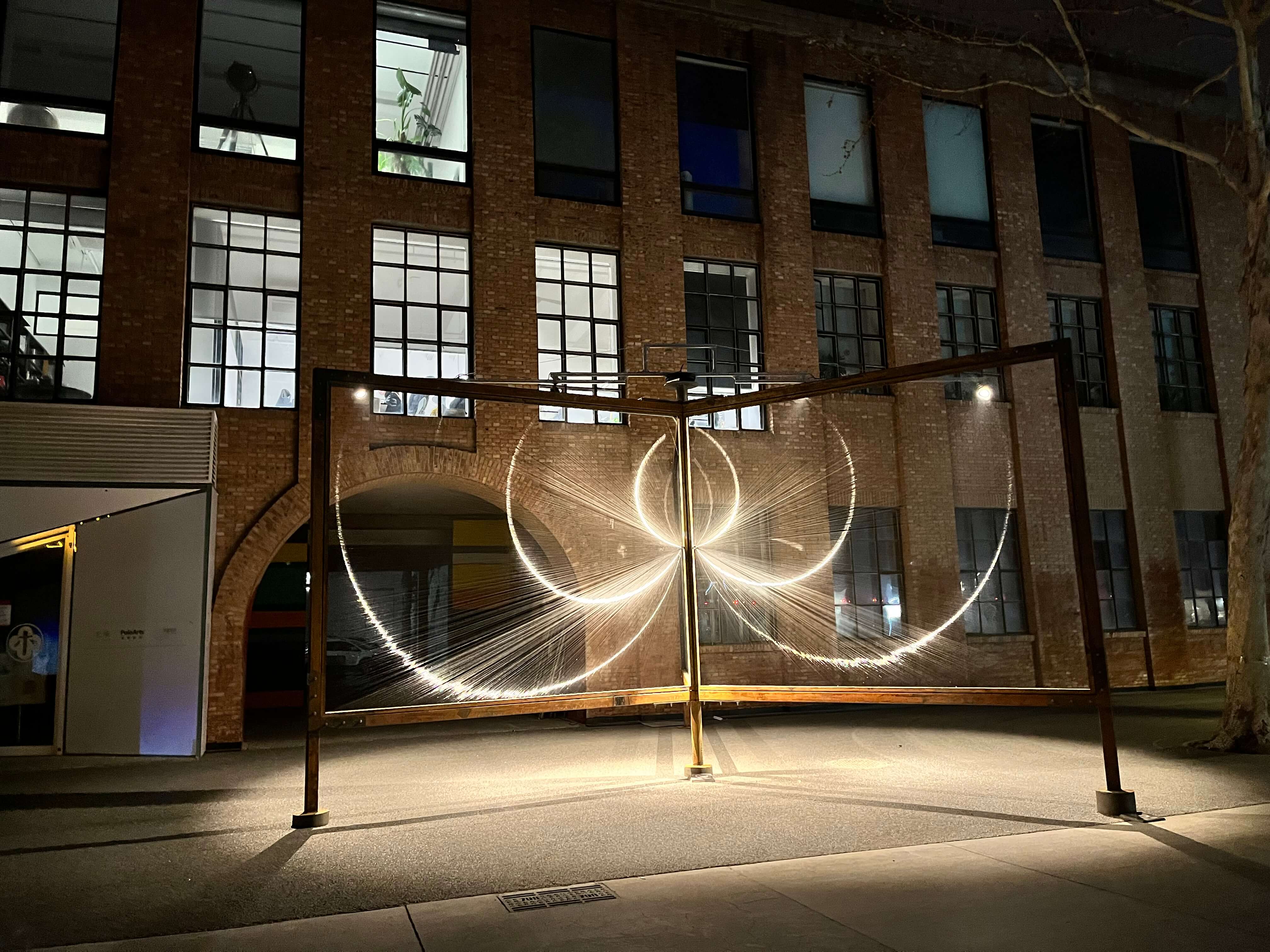 青年藝術家楊淞戶外裝置作品《光環》在798藝術區公共區展示光線的點線面神韻